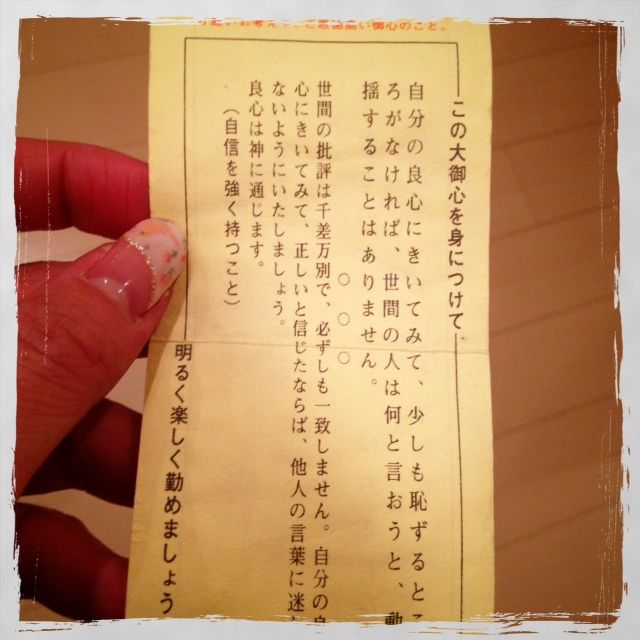 今回のメッセージは、「世間の批判は千差万別で、必ずしも一致しません。自分の良心にきいてみて、正しいと信じたのならば、他人の言葉に迷わないようにいたしましょう。良心は神に通じます。(自信を強く持つこと)」と書いてありました。読み終えた後、「よし」という気持ちになりました。
