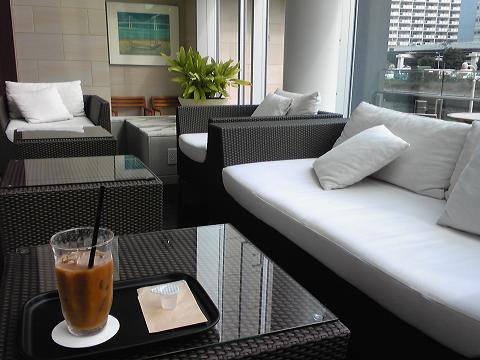 ジムのラウンジでアイスコーヒーを飲みながら