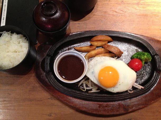 ジュー!!!!と音をたてた熱々の鉄板に乗って出てきました、ハンバーグ。