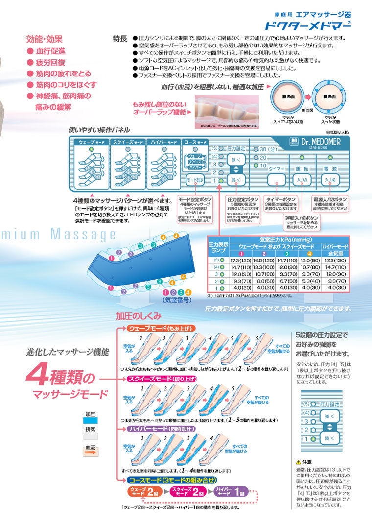 エアバッグの加圧も4種類あります。上記カタログにも記載されているように、血液の流れを見ることができます。もみあげ、絞り上げなど選べます。