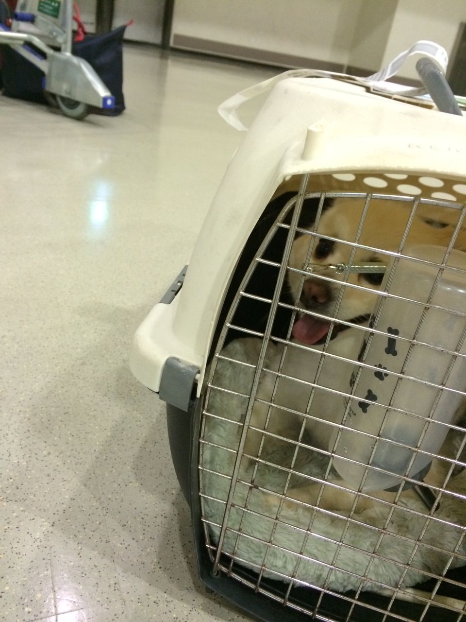 無事に成田空港に到着!係員の方に運ばれてやってきたモコは、笑顔で一安心。