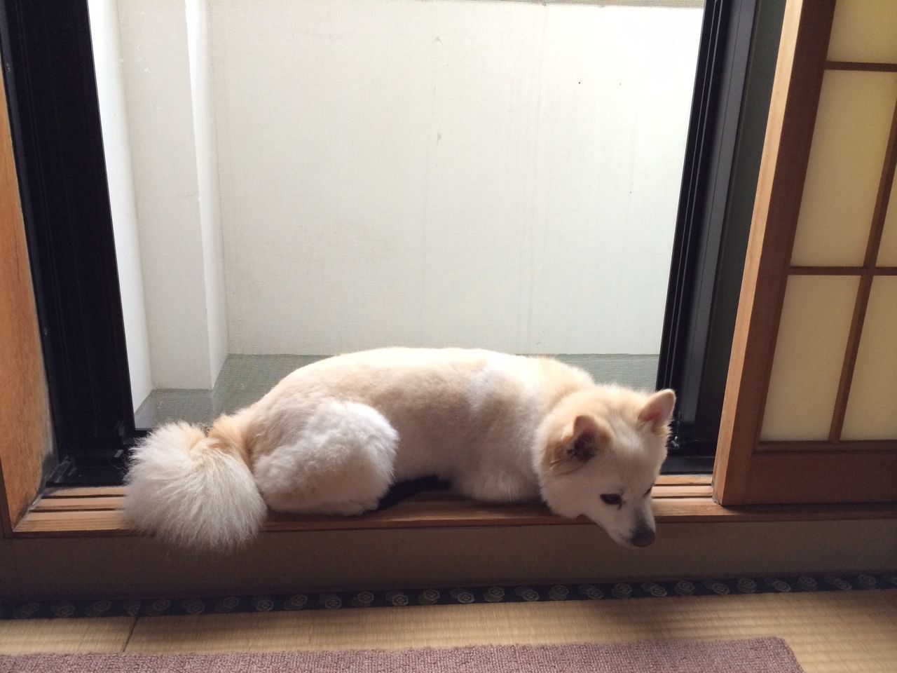 あついよ~ 2014.08.05 04:08 ねぇ、ママの生まれた札幌ってもっと涼しいところじゃなかったの?と言いたげ?かどうかは分かりませんが、とにかく暑いです!連日30度超えで、しかもからっとしているはずの北海道なのに、ジメジメ。むんむん。朝6時に散歩に出ても、すでに汗だくになります。。。こんな湿気と暑さを体験したことのないモコは、涼しい場所を求めて家の中を移動。で、ここに落ち着きお昼寝。