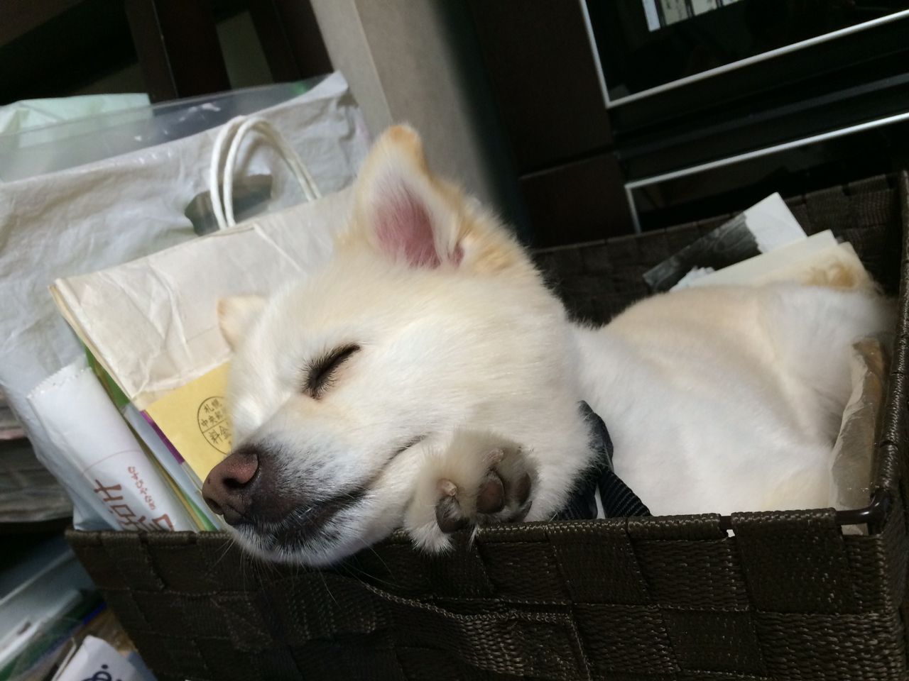 挙動不審中 2014.08.06 01:04 ここはどこ?いつ帰るの?なんかいつもと生活パターンが違うよね?!ってな感じで、モコはまだまだ新しい環境と生活に落ち着かない様子。家の中は一通り探索を終えたけど、なんか落ち着かないよーと言いたげに挙動不審。で、やっと見つけた落ち着き場所がここ。書類を入れていたかごに入り込んで、そこで寝てしまいました(^^;;