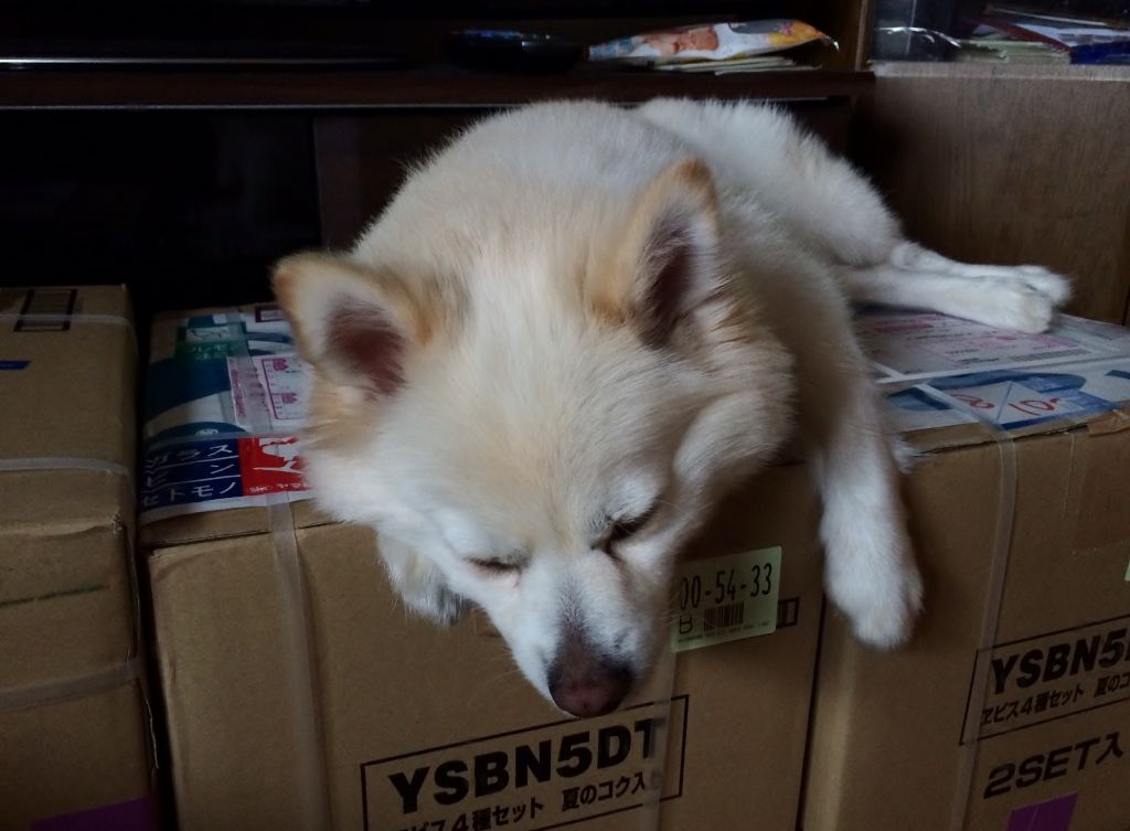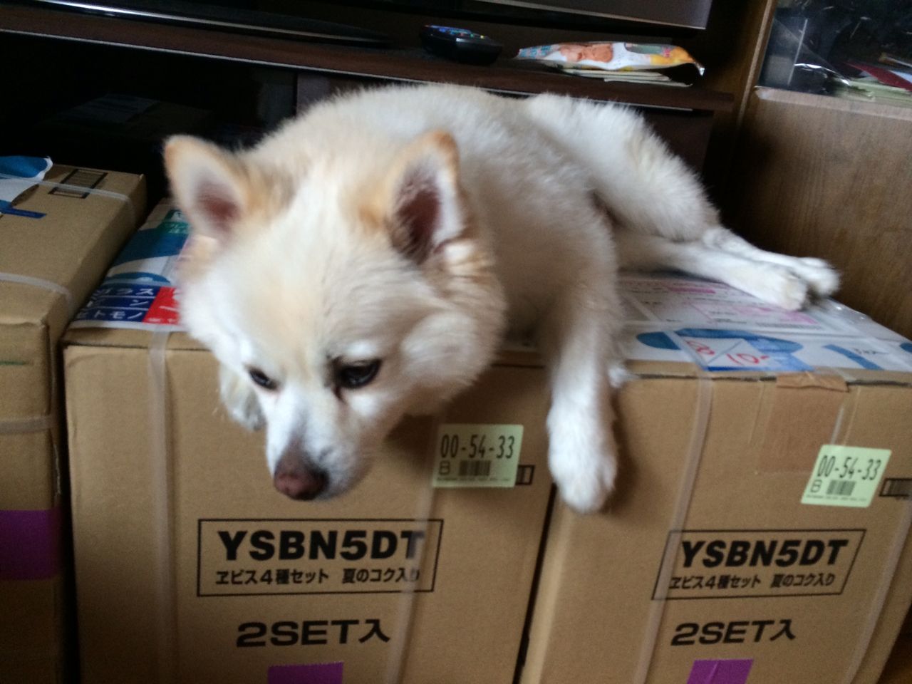 君は猫? 2014.08.10 06:09 普段から高いところが大好きなもこ。実家に来てからは、机の上がもっぱらのお気に入り場所になっていますが、今日は届いた荷物の上でさっそくお昼ね。なぜか?猫のようにいつも、何かの上にぴょんとジャンプしてそこで寝てしまうのです(^^)