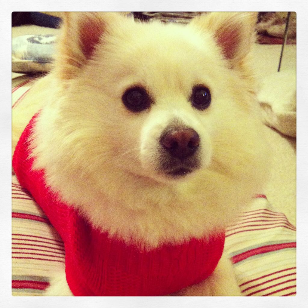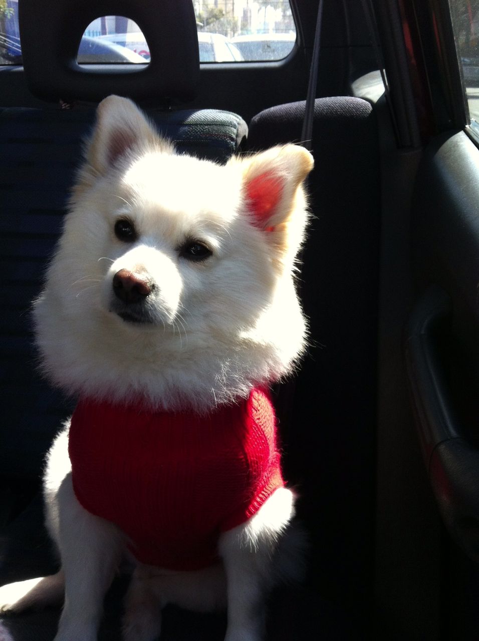 2年前にロスに遊びに来た時は、いっぱいかわいがってもらい、「もこにセーター買ったよ」と真っ赤なセーターを送ってくれたのですが、おデブちゃんのもこはちいとばかしぴちぴち(^^;;
