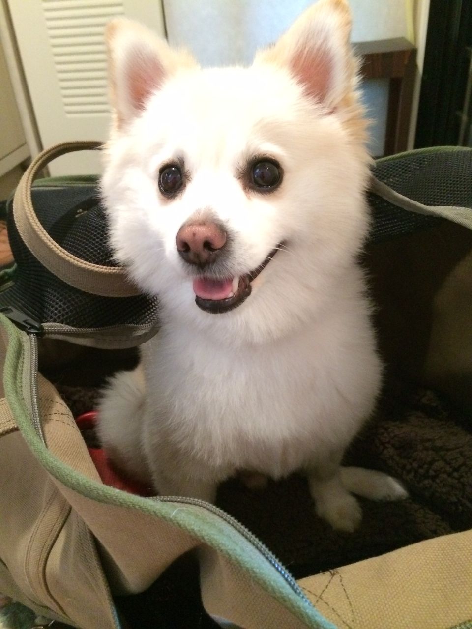 お出かけバック初トライ 2014.08.13 12:47 LAでは気楽にどこへでもリーシュだけで連れて歩ける環境だったので、すっかりそれに慣れていたのですが、日本ではこれが必需品なんですね。。。と言うことで、お出かけバックを購入。さっそく試しています。最初はちゃんと大人しく入ってくれるのか心配だったけど、3日くらいで慣れて、お出かけと言うとちゃんと自分でバックの中に入ってくれるようになりました♪でも、7キロ弱のモコを抱えて歩くのはちょっと重い(~~)