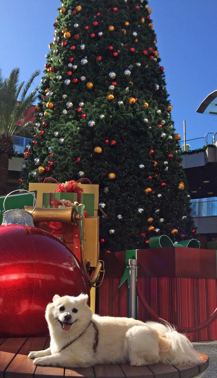 もうすぐクリスマス。大きなツリーと一緒に今年も記念撮影。さて、モコはサンタさんに何をお願いするのかな?