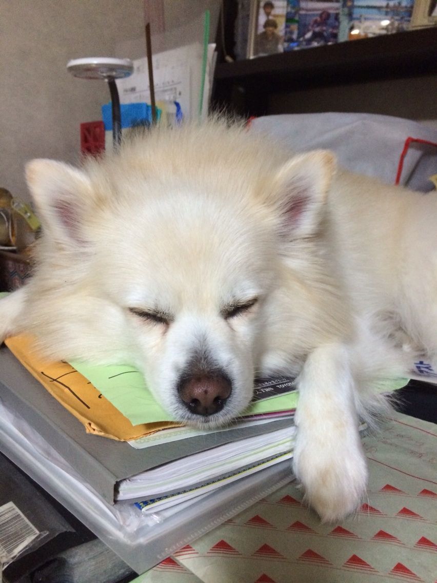 ふてくさりモモたんは、書類の山の上でふて寝