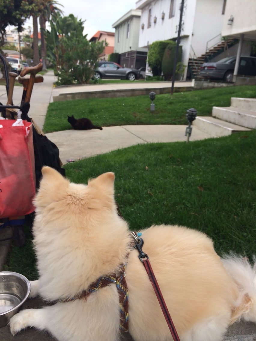 視線の先にはまだネコを捉えてます。でも、本当はエサ盗みたくても怖いから、近ずけないんだよね