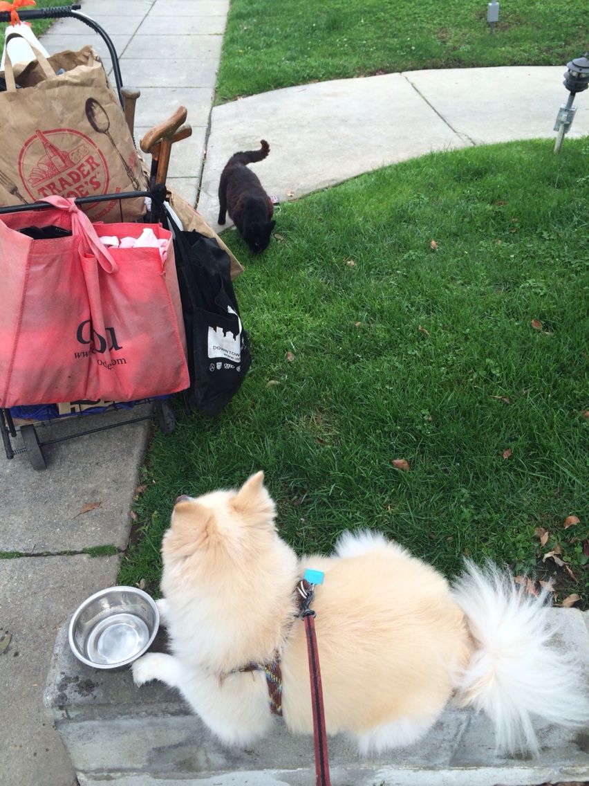 散歩中、モコが大好きなおばあちゃんに遭遇。おばあちゃんは毎朝、野良ネコにエサをやるのが日課。