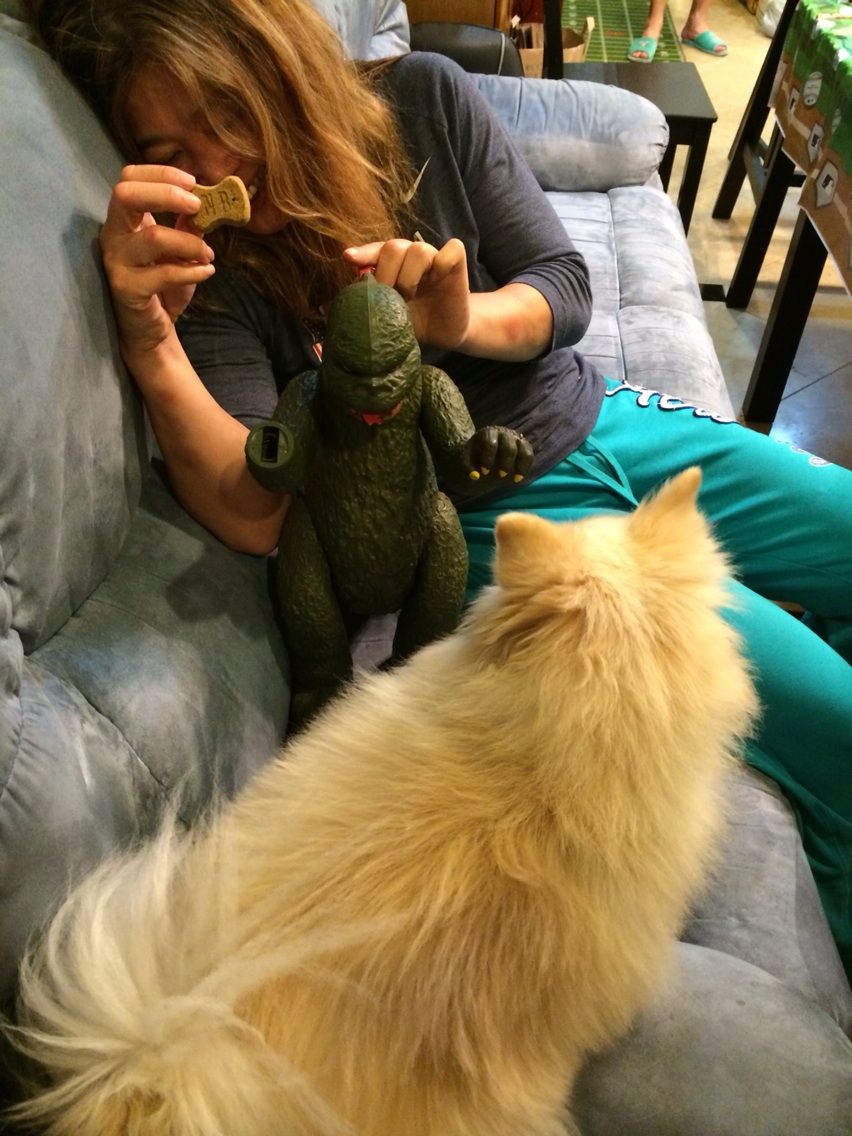 マミーは今日は、ゴジラ関係のお仕事。撮影でお借りしたゴジラとモコちん初対面。かなり、怖いようで…微妙な距離感。近寄れないモコは、ゴジラに撃沈~_~;