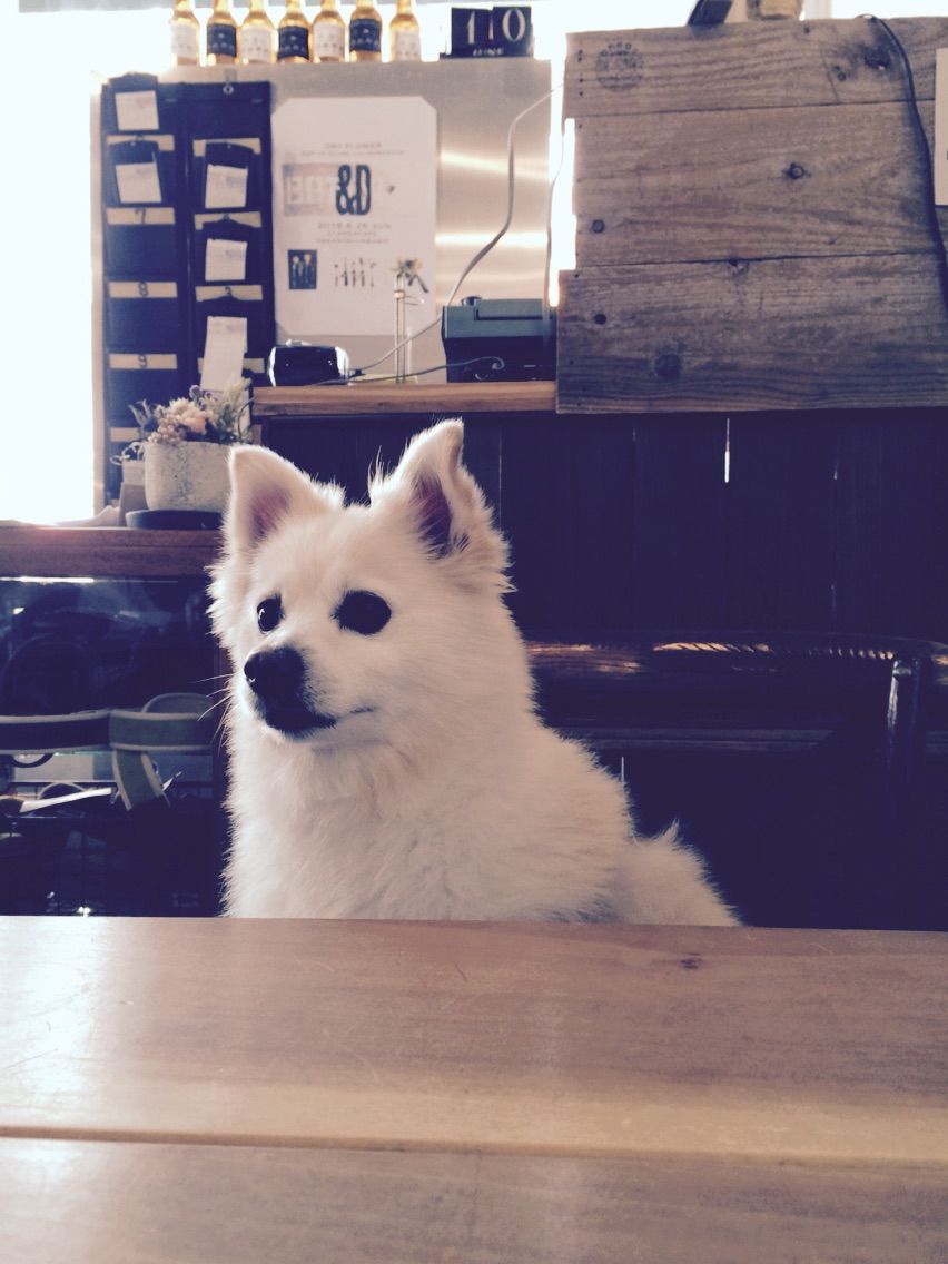 さっそくカフェに。他のわんちゃんや店員さんに興味深々