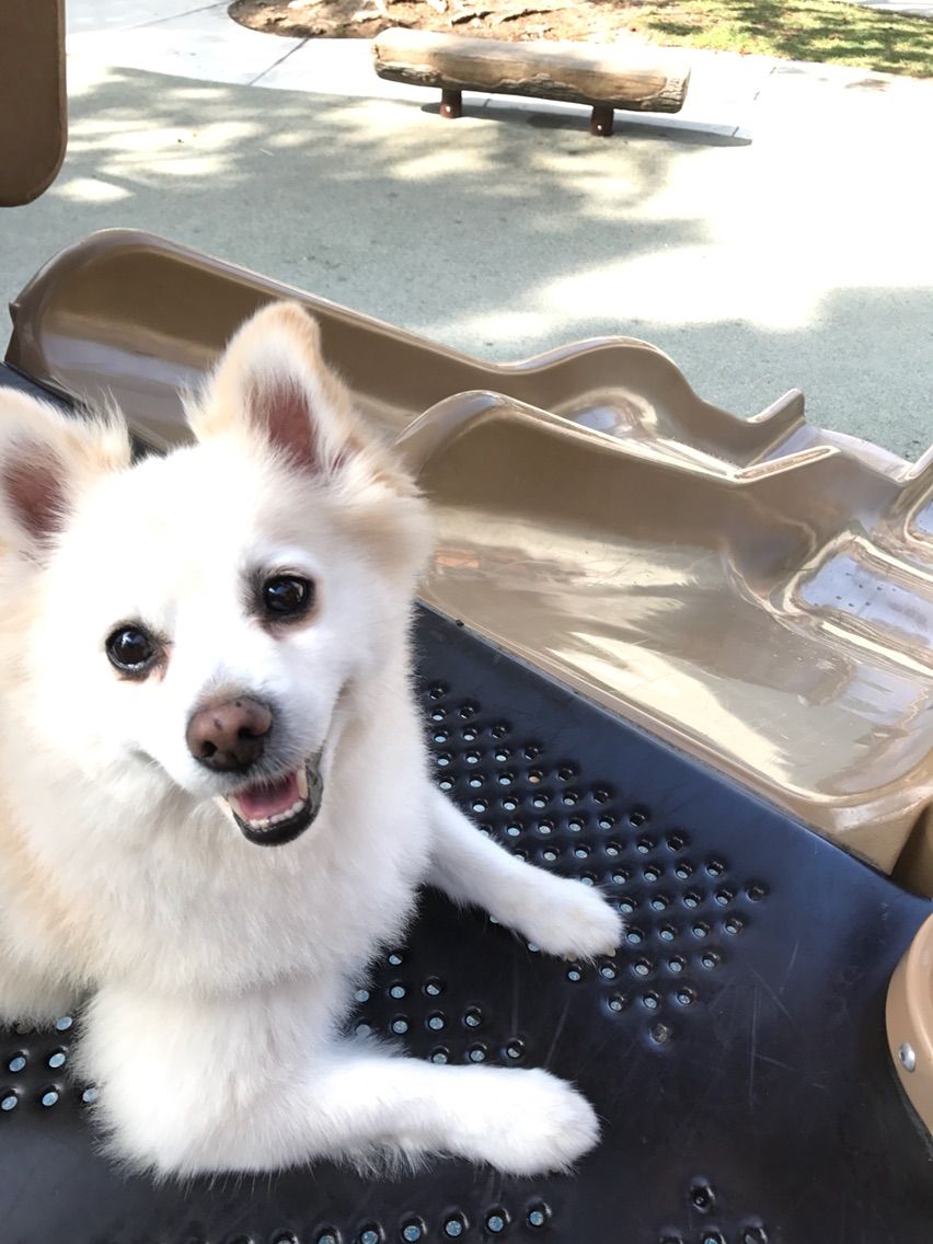 やっぱり怖いよ〜 2017.08.11 19:48 近所の公園で誰もいなかったので、滑り台に挑戦してみることに。他のわんちゃんが遊ぶのみたことあるから、いけるかな? 上まで登ってみたモコは下を眺めて はい。次の瞬間振り返りこの顔。え?降りるの?無理でしょと無言の抵抗