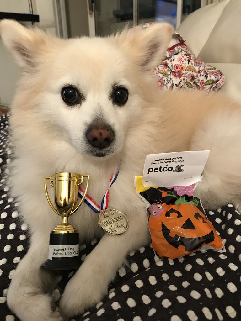He won Scariest Dog and got little trophy and medal as well as treat bag.