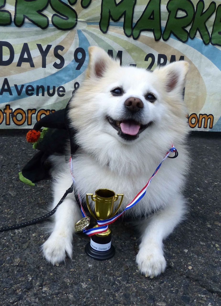 もこが大好きな近所のファーマーズ・マーケットのドッグ・デイ・ケアで、ハロウィーンのコスチュームコンテストがあり、もこは魔女のコスプレでScariest Dogに輝きました♥ トロフィーとメダルももらい、ご満悦なもこちん
