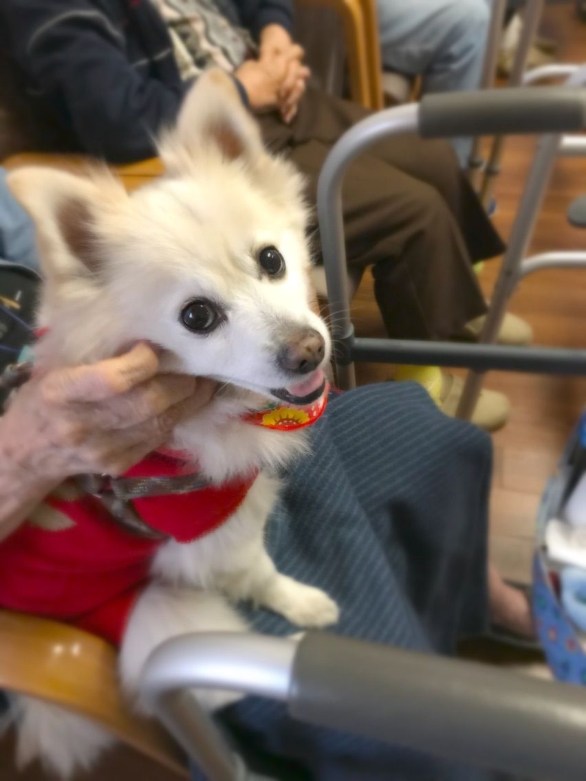 クリスマスのボランティア 2017.12.26 06:03 ハロウィンにボランティアに行った日系人の介護施設にまたボランティアに行って来ました。 前回、モコちゃん大人気でとっても大人しくて良くできたので、また来て欲しいと言ってもらい、2時間ほど犬好きのおじいちゃん、おばあちゃんと触れ合ってきました。 来年は講習受けて正式ボランティアとして登録して欲しいとお願いされました。楽しそうにしてるし、サービスドックに向いてるみたいね、モコは。