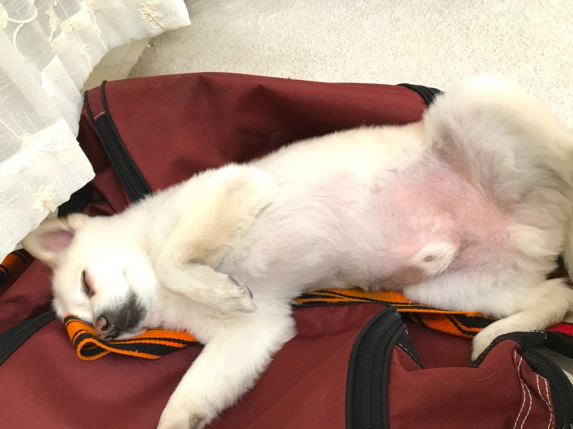 気持ち良さそうに爆睡してるモコが、寝てるのはボストンバックの上