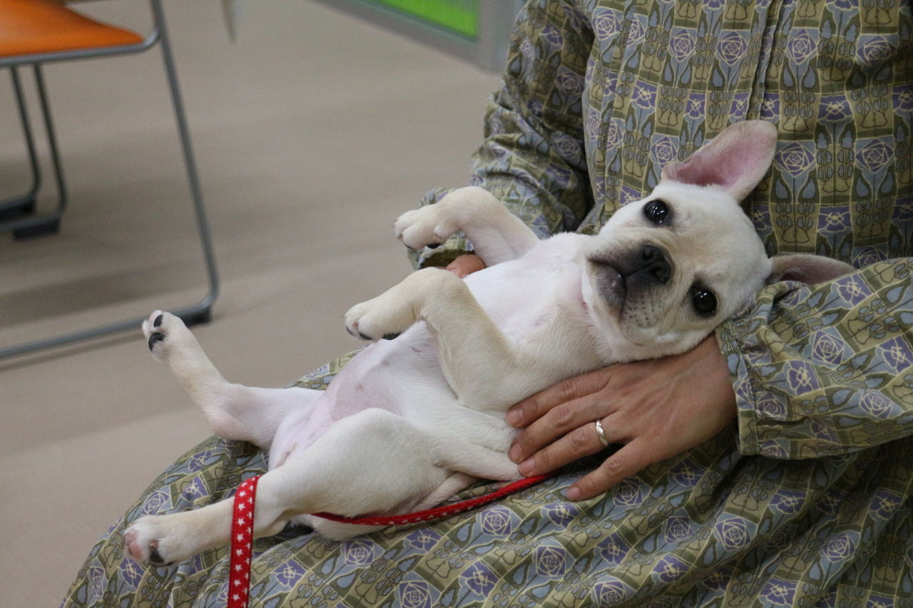 今日のパピークラスは「おすわり、伏せ、バーン(ごろん)」、「排泄トレーニングとマナー」、「健康管理」についてでした。