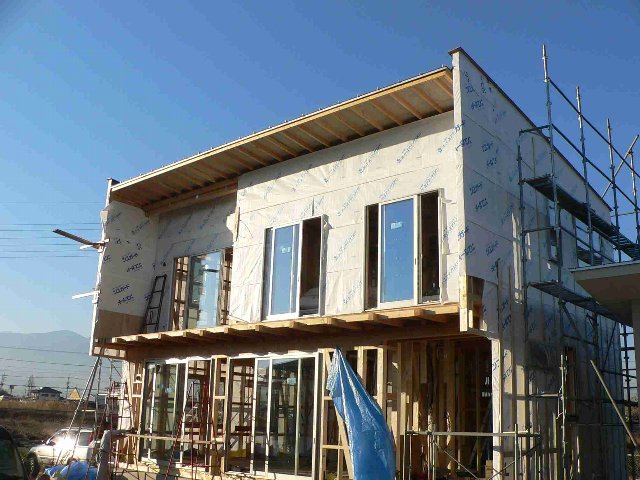 #65 SH邸 No.1 2005.12.29 13:35 現在進行中の現場です。木造(在来工法)2階建て、延床面積約40坪の住宅です。工事進捗は60%程度。今年最後の現場打合せを行いました。次世代省エネ基準に適合した仕様となっている為、断熱層・気密層・通気層などに基準があり、一般的な木造在来工法よりも多くの工程が必要となります。