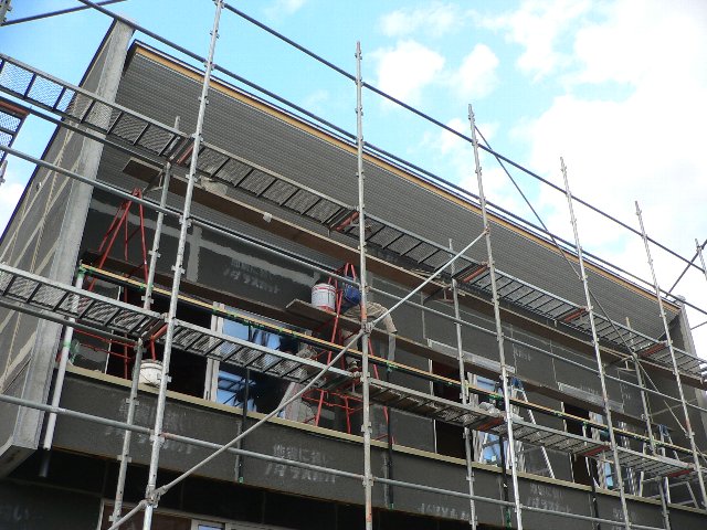 #79 SH邸 No.4 2006.02.14 14:54 今日、軒天のガルバリウムが張り終わりました。これまでは主に下地の工事を行ってきたのですが、いよいよ仕上の工事に移行します。外部に関しては、この後、モルタル塗り→吹付け仕上げとなります。内部も造り付け家具の搬入が始まり、フローリング張り、クロス張り、塗装工事と順次進んでいきます。工事進捗は75%程度。3月末に完成予定です。ところで今日はバレンタインデーでした。あと数分で終わりですが。。。。