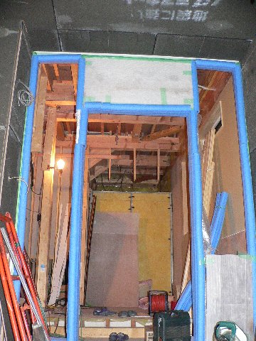 #83 SH邸 No.5 2006.02.22 16:58 2/22 SH邸 現場打合せを行いました。定例として週1回行っています。本日は21:00~0:00までの3時間でしたが、長い時には6時間くらいかかります。玄関ドアが昨日搬入されました。養生してあり、ドアも取り付けてありませんので、今の時点では、どんな形かは写真では判りませんが、スチール製特注、焼付塗装の仕様となっています。