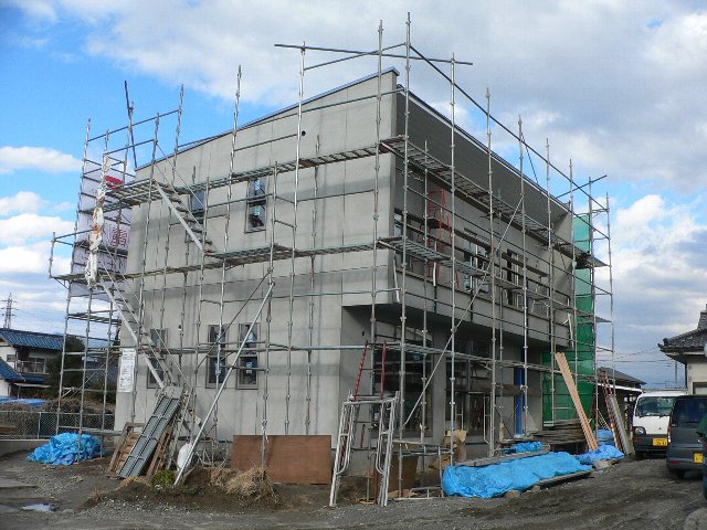 #94 SH邸 No.6 2006.03.02 10:52 現場打合せを行いました。外部モルタル塗が終了し,いよいよ建物の形が整いました。モルタルの乾燥期間を取って外壁塗装吹付けとなります。内部工事ではキッチン搬入が済み、細部の造作工事中です。外部・内部共,シンプルなデザインとなっていますが,それだけに施工はシビアで,現場は非常に苦労しています。3月末日完成予定ですが、あと1ヶ月が待ち遠しい物件です。