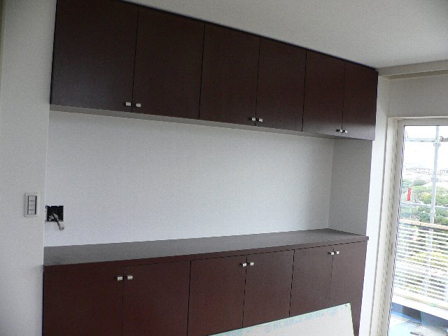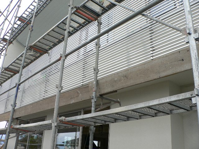 #112 SH邸 No.10 2006.03.18 10:15 3/18 SH邸 現場監理バルコニーアルミルーバーの取付中です。 既製品のルーバーではなく、現場製作の為、ルーバー1本ごとにビス止めしています。内部は一部の部屋でビニールクロス張・創り付け家具据付完了しました。 室内は白系統の色でまとめていますが、一部の家具の色でアクセントをつけています。写真は寝室ですので落ち着いた色としています。