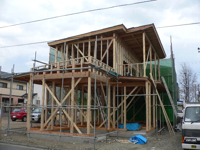 #113 OH邸 No.10 2006.03.18 10:24 3/18 現場打合せ建て方の後、破風板・野地板張,桟木打ち,ルーフィングシート張が完了しました。壁胴縁と接合金物の取付作業中。外部の骨組みがほぼ出来上がったというところです。屋根・壁等の細部取り合いを打合せしました。この後、屋根・サッシ取付工事に入る為、カラーサンプルを取り、施主と色の検討に入ります。