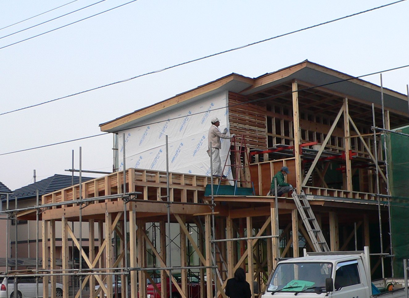 #119 OH邸 No.11 2006.03.21 18:37 3/21 現場監理と施主打合せを行いました。現場は,外壁下地板取り付け中,追って透湿シート張作業中です。 施主打合せでは,屋根・破風板のガルバリウム鋼板の色,アルミサッシの色を検討しました。これらの部分的な色は,単独では決められませんので,建物全体の色彩計画を提案・打合せの上での検討となります。本計画では,計画当初から色彩も含めて施主と検討して来たため,比較的スムーズに決定しました。