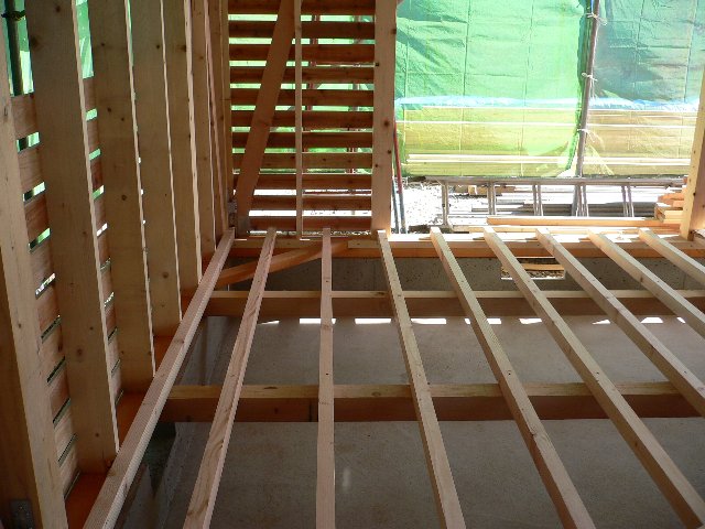 工事は現在,内部木工事,床下地の根太取り付け中です。
