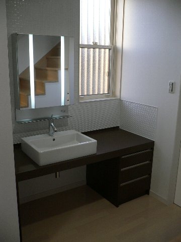 #145 SH邸 No.15 2006.04.03 18:46 4/3 残工事(別途工事)の完成確認を行いました。2F廊下手摺のガラス工事完了。間取り的には建物の北側の廊下なのですが,明るい雰囲気に仕上がりました。 1階洗面カウンター工事完了。廊下に面して洗面カウンターを設けることによりゆとりのある空間となりました。