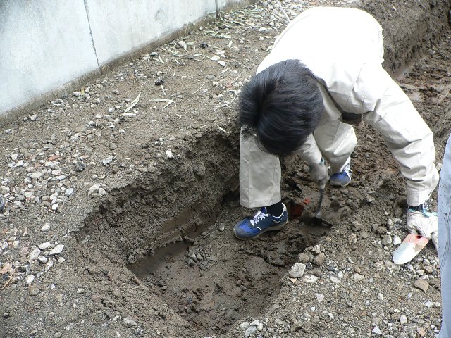 #222 Excavate? 2006.11.22 14:23 11/20 YA邸 埋蔵文化財の調査を行いました。建設地は,埋蔵文化財の包蔵地である為,設計時に工事の届出を行っています。工事による掘削の規模や,周辺の発掘状況などから,遺跡の調査方法が決まるのですが,本工事では,教育委員会の担当者の立会い確認を行いながらの掘削工事となりました。今回,遺跡の発掘は,ありませんでした。(遺跡が発掘された場合,工事は中断し,本格的な発掘調査を行わなければなりません。)今後は,基礎工事を行い,12月の前半に建て方を行う予定です。