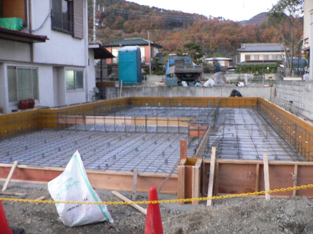 #224 examine the reinforcing rod 2006.12.03 10:59 12/3 YA邸 基礎の配筋工事が完了しましたので,配筋検査を行いました。配筋検査では,鉄筋の形状寸法・位置・間隔・かぶり厚さ・定着長さ等の確認を行います。基礎は,後からやり直しが出来ないので,特に慎重に検査を行いますが,何とか暗くなる前に完了することが出来ました。明日,土間コンクリート打設の予定です。