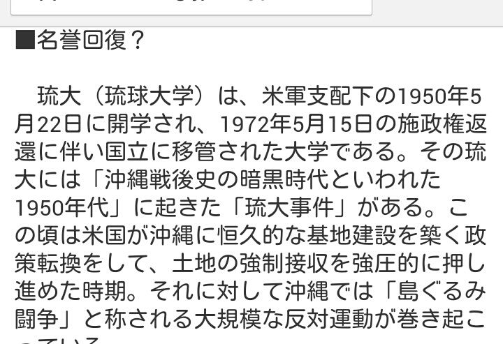 琉大(琉球大学)は、米軍支配下の1950年5月22日に開学され、1972年5月15日の施政権返還に伴い国立に移管された大学である。その琉大には「沖縄戦後史の暗黒時代といわれた1950年代」に起きた「琉大事件」がある。この頃は米国が沖縄に恒久的な基地建設を築く政策転換をして、土地の強制接収を強圧的に押し進めた時期。それに対して沖縄では「島ぐるみ闘争」と称される大規模な反対運動が巻き起こっている。