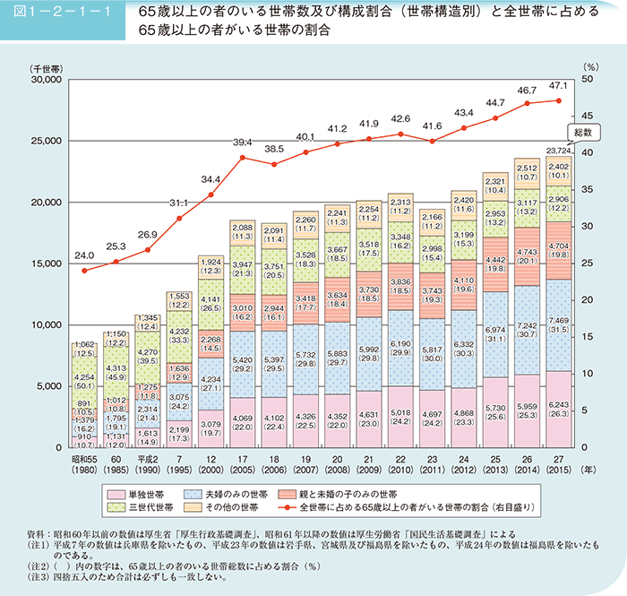 内閣府の資料によると、平成27(2015)年現在、65歳以上の高齢者のいる世帯数は2,372万4千世帯と、全世帯(5,036万1千世帯)の47.1%を占めています。