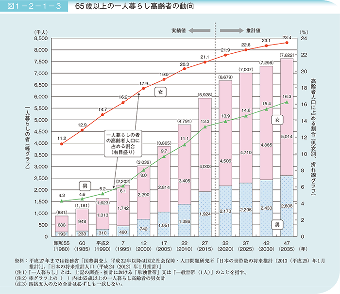 また、65歳以上の一人暮らし高齢者の増加は男女ともに顕著で、昭和55(1980)年には男性約19万人、女性約69万人、高齢者人口に占める割合は男性4.3%、女性11.2%でした、平成27(2015)年には男性約192万人、女性約400万人、高齢者人口に占める割合は男性13.3%、女性21.1%と一人暮らし高齢者が増加傾向にあります。