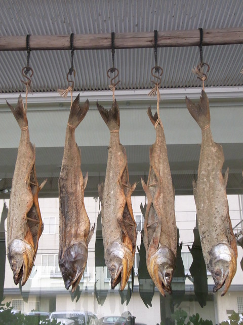 宿泊したホテルの玄関上には鮭が干してあり、街中の