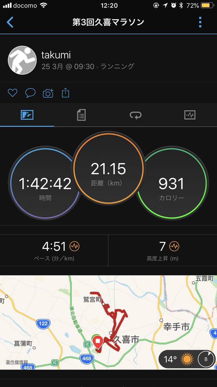 第3回よろこびのまち久喜マラソンに参加しました 2018.03.26 01:25 先日は、第3回よろこびのまち久喜マラソンに参加して来ました。自分自身5回目のハーフマラソンでした。タイムは1時間43分19秒(公式)1時間42分42秒(ネット)でした今まで5回の大会の中では2番目に良い記録でした。天候も良すぎて途中脱水状態になりそうでしたしかし、路上の応援や、ボランティアの皆さんのおかげで完走を果たすことができました。来年も参加します。来週は幸手さくらマラソンに参加します暑さに負けないよう頑張ります。