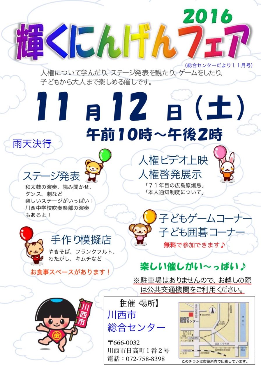 輝く人間フェアに出演します 2016.10.25 13:09 輝く人間フェアに出演します! *終了しました* 平成28年11月12日(日)13:40~14:00 (約20分間) 川西総合センターにて 「八祭」などの三演目を演奏します。ぜひ見に来てください!