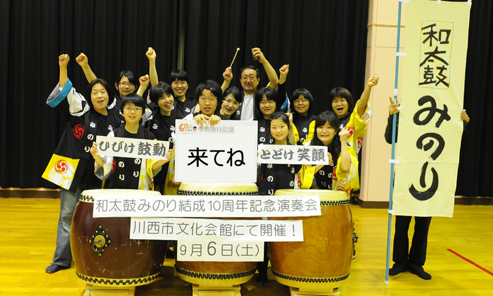 両端に置いてある「和太鼓みのり」と書かれたのぼりは、荻野丹雪氏に書いていただいたものです。