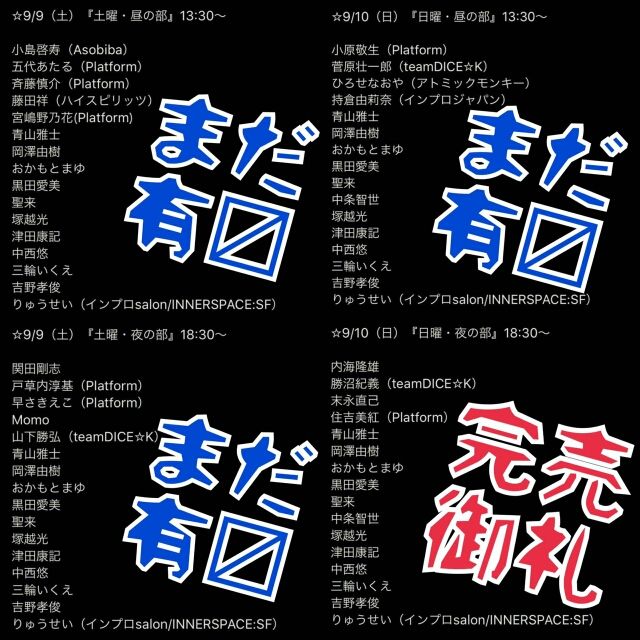 【出演】INNERSPACE主催 2017.07.20 03:42 先日MATCH秋の陣に向けての初稽古が行われました。今回はINNERSPACEメンバーほぼフル出場。精鋭客演の皆様、常連さんも初出場の方も剛健知的艶美期待が高まります。新たな課題をもって挑む即興トーナメントバトル。更に興味深く。更に面白く。 本番一月半前にして早くも完売回が出ました。ご予約お早めに。 悠姉さんがつくってくれました。