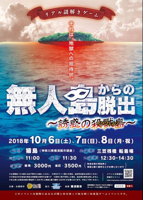 【出演】リアル謎解きゲーム『無人島からの脱出~誘惑の殺戮島~』 2018.10.12 11:31 実際の!無人島で!リアル謎解きゲームだよ!画像と日程が違うのは追加公演だからです。先だって三日間本番を終えてきましたが、猿島凄く綺麗。観光だけでもとってもおススメです。現時点でチケットは完売ですが、謎解きゲームあるあるで直前になるとツイッターでメンバー募集されてたりします。要チェック!