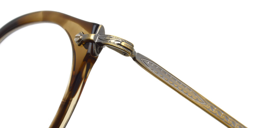 往年のVINTAGEフレームを彷彿させる温もりのある質感のアセテートと、繊細な彫刻を ほどこしたメタルパーツとの絶妙なハーモニーが美しい