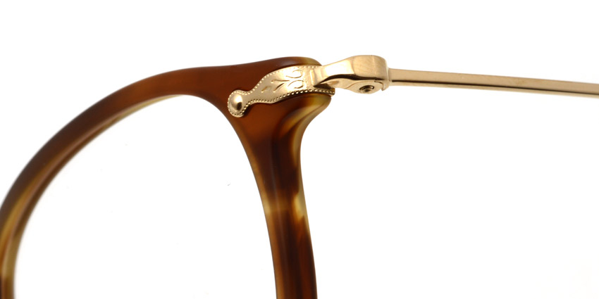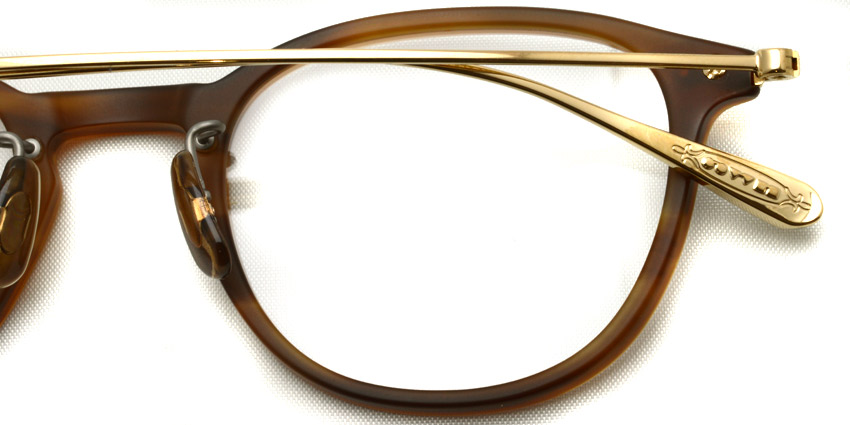 テンプル根元のヨロイパーツやテンプルエンドのオリバーピープルズのロゴマーク「●●■■▼▼」の装飾が見事です