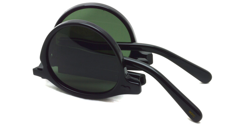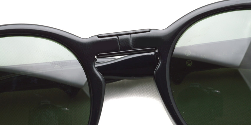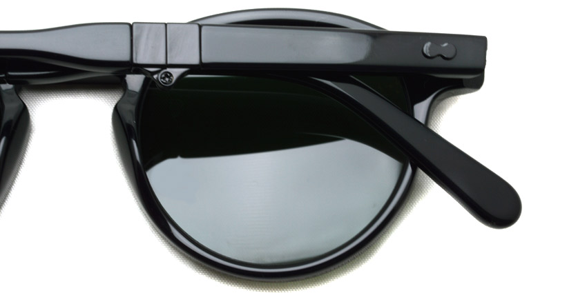 オリジナルのレンズシェイプはそのままに、フレームからカシメを含むメタルまで光沢のあるブラックで統一