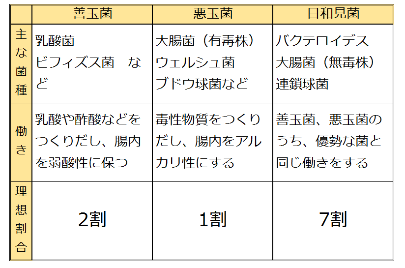 ①善玉菌 ②悪玉菌 ③日和見菌があります。
