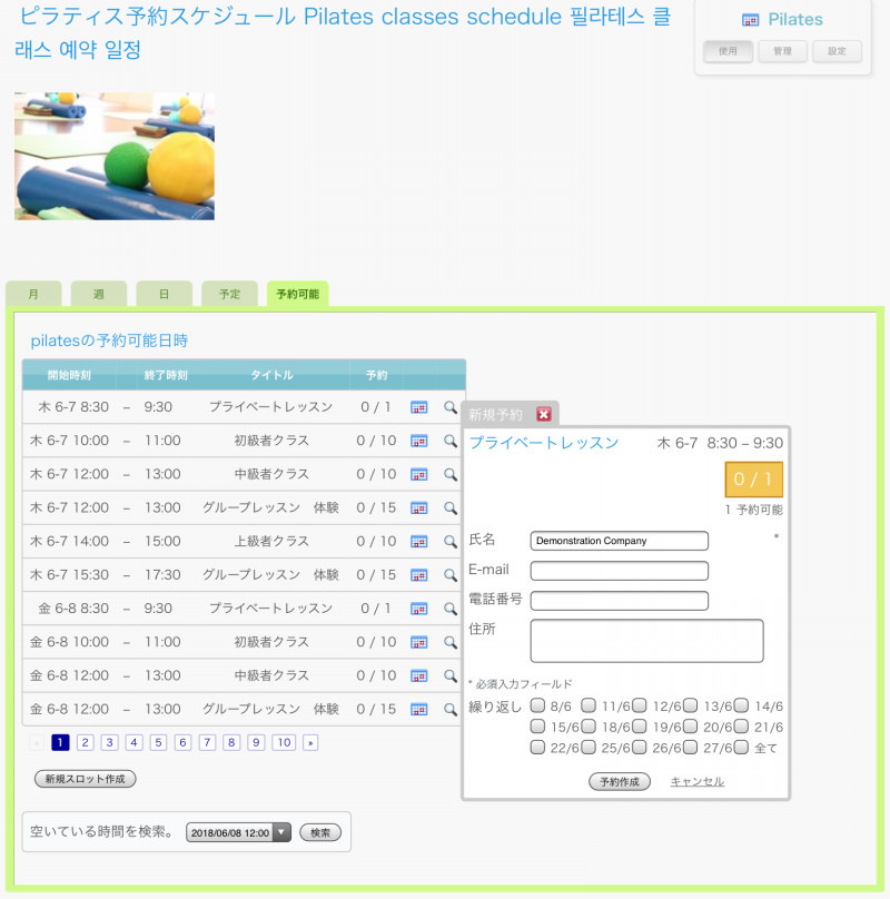 もちろん修正も可能であり、修正は一連の作成した予約枠全体又は単体に及ぼすか選択可能。キャンセル待ちの設定で各クラスの収益の機会損失を防ぐ 予約状況はリポート機能で分析、ダウンロード可能ピラティスレッスン 少人数制のピラティスレッスンの予約を想定した設定デモです。会員登録機能、クーポンコード設定、キャンセル待ち、自動リマインダー機能他多様な機能を搭載しておりピラティススタジオの予約管理に役立ちます。