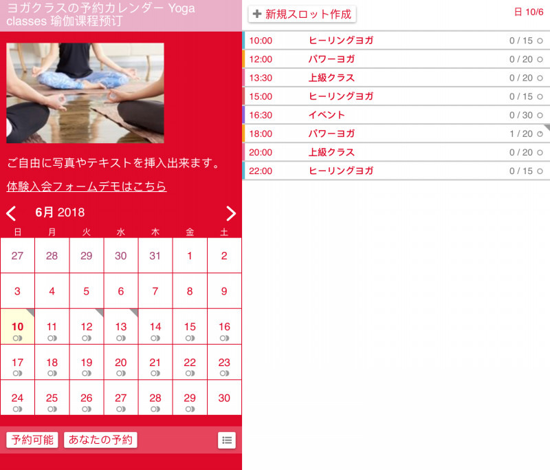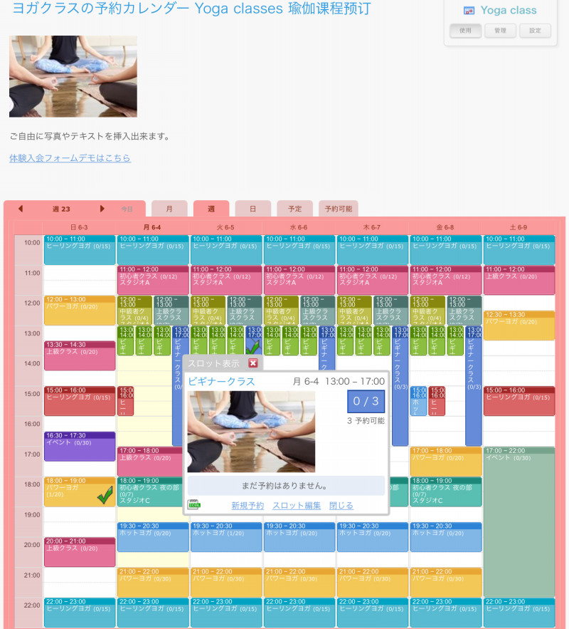 予約スケジュールや予約の説明欄に画像を直接アップロード又は貼り付けることはできません。スケジュールに画像をリンクするURLを所持している必要があります。 SuperSaaSは多業種対応予約システムの為、非常に多様な業種のビジネスにご利用頂いていますが、ヨガスクールでも非常に多く導入頂いております。今回のデモは体験、入会申込フォームの例を定員制のレッスンカレンダーに添付しています。体験レッスン等の受付スケジュールが決まっている場合はレッスンカレンダーに明記するのも良いかもしれません。