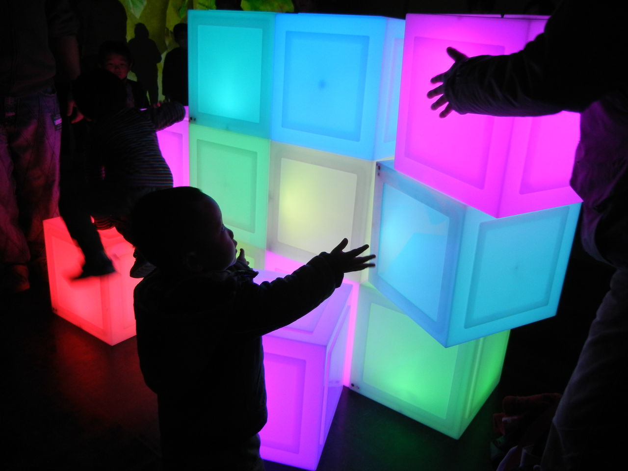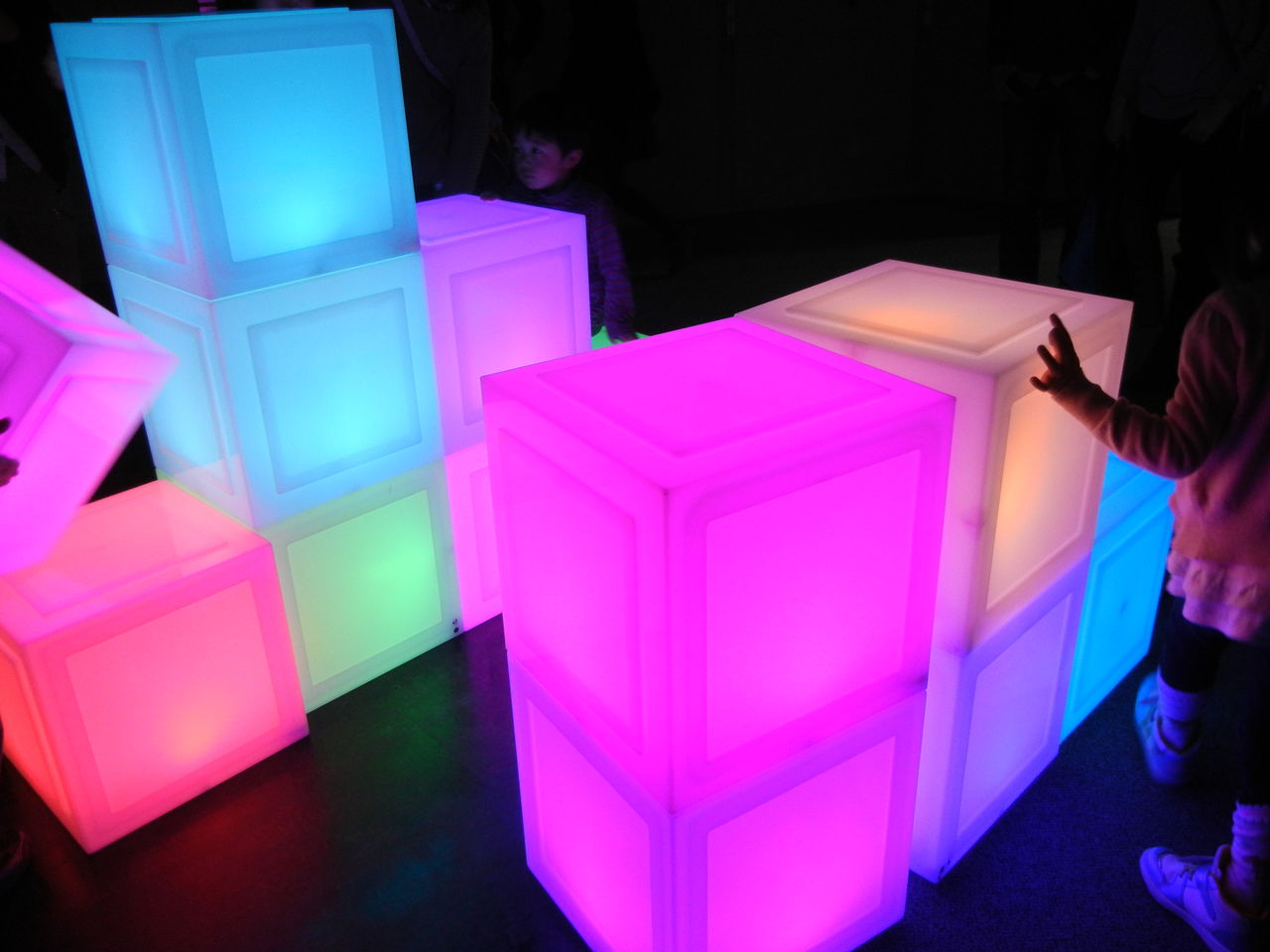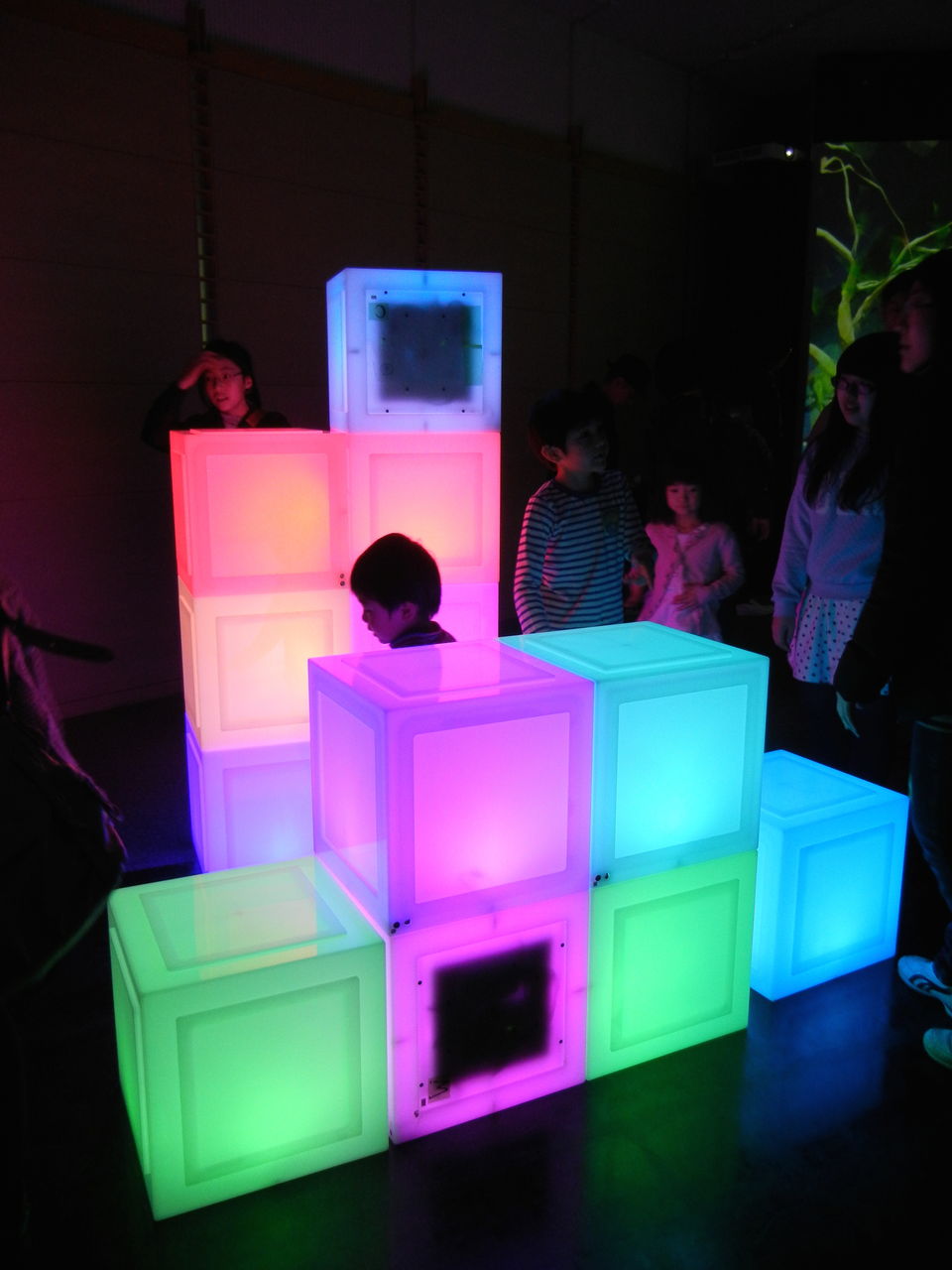 イスのような、照明のような、正方形のブロック。積み重ねたり横につなげると、隣のブロックの色に影響され、絵の具を混ぜるようにブロックの色が変化します。