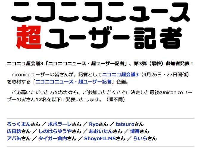 【超ユーザー記者、すべての参加者が決定 - ニコニコインフォ】